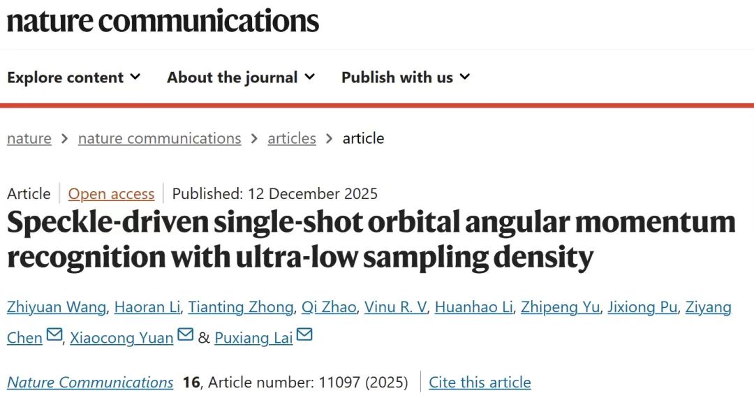 近日,我院蒲继雄教授、陈子阳教授团队,联合香港理工大学赖溥祥教授团队、深圳大学袁小聪团队,在国际权威期刊《自然·通讯》(Nature Communications,中科院一区,影响因子15.7)上发表题为“Speckle-driven single-shot orbital angular momentum recognition with ultra-low sampling density”的最新研究成果(DOI: 10.1038/s41467-025-66074-3)。